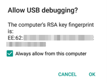 A dialog should show on your device, asking you to allow usb debugging. Check “Always allow from this computer”, and choose “OK”.